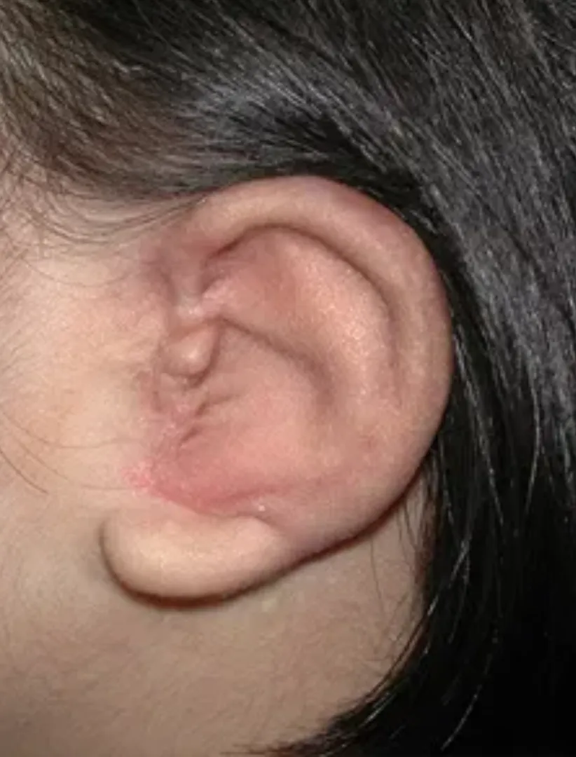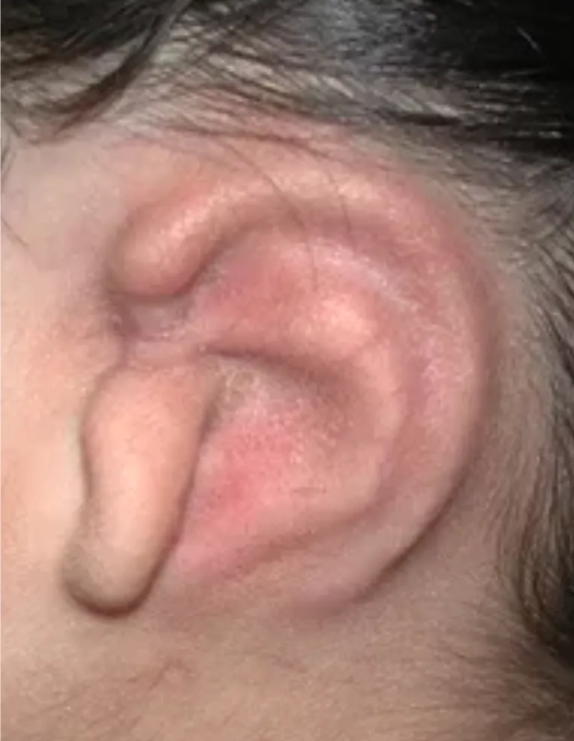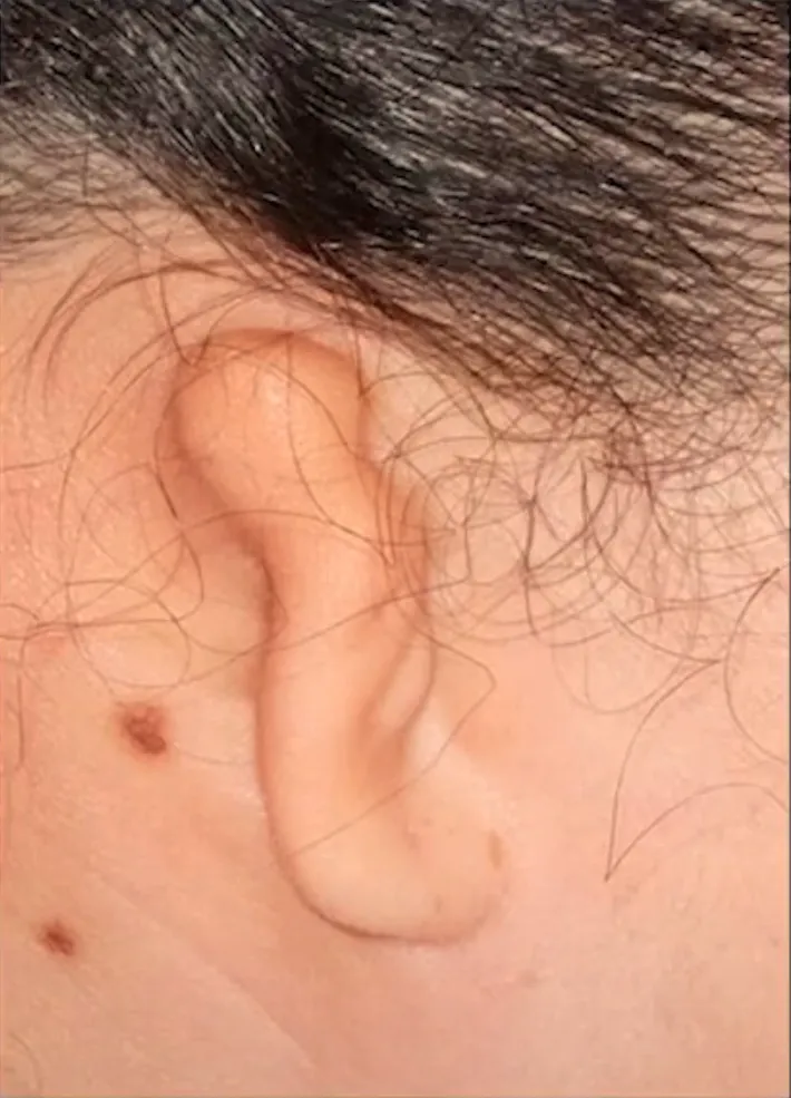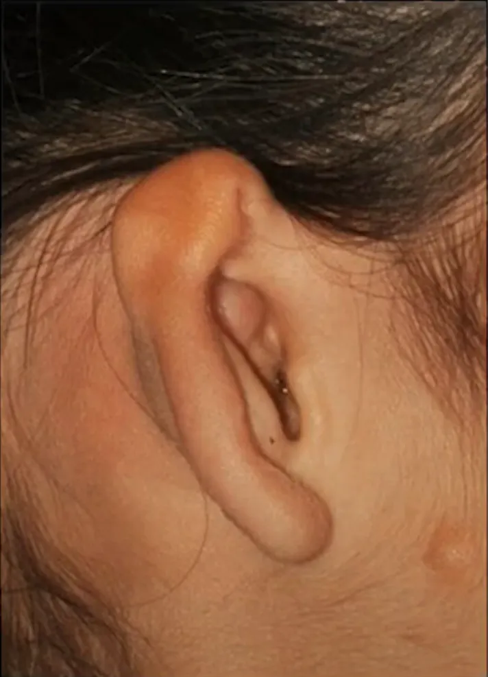 Someone born with a small, deformed ear or ANOTIA - no ear.