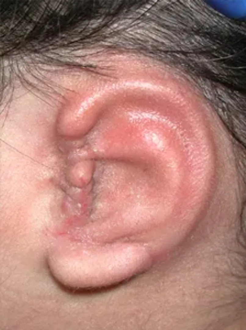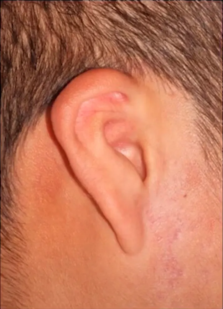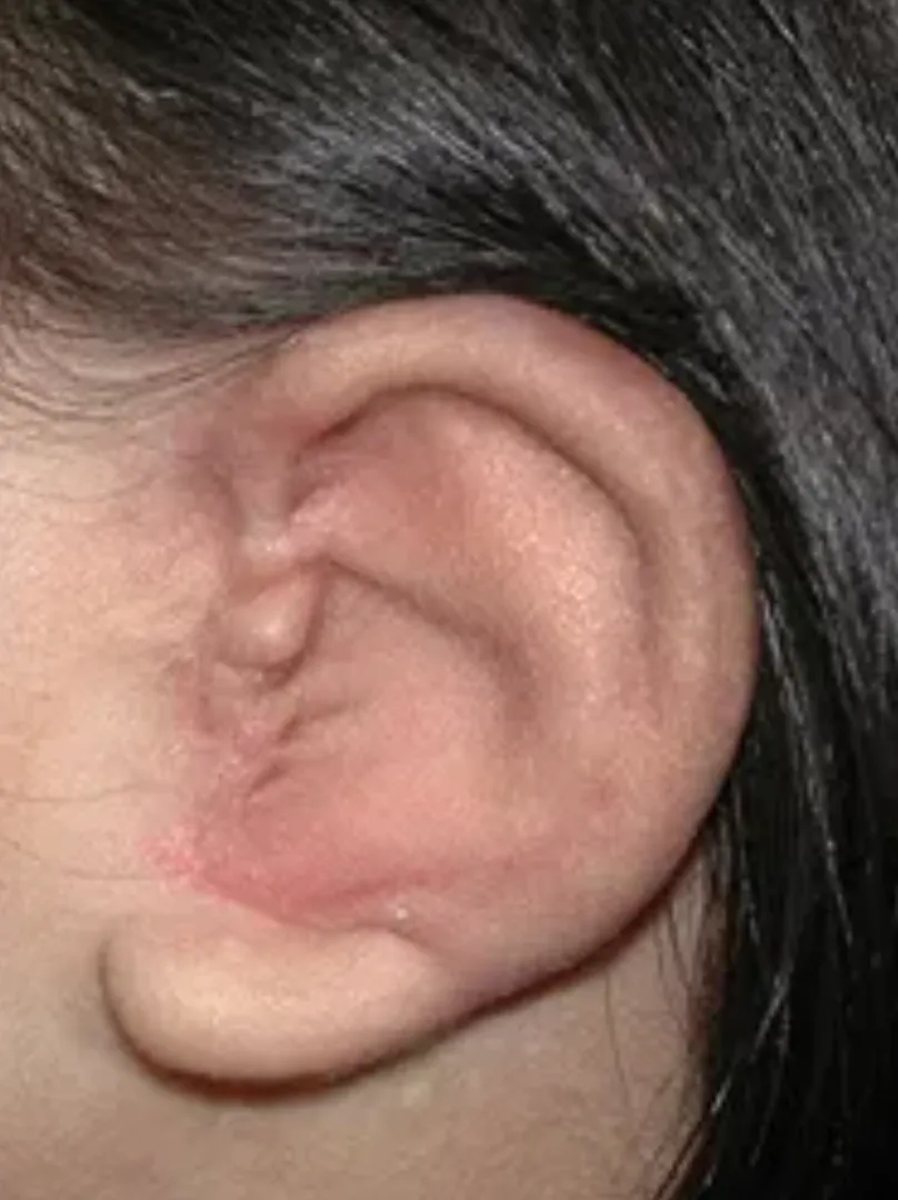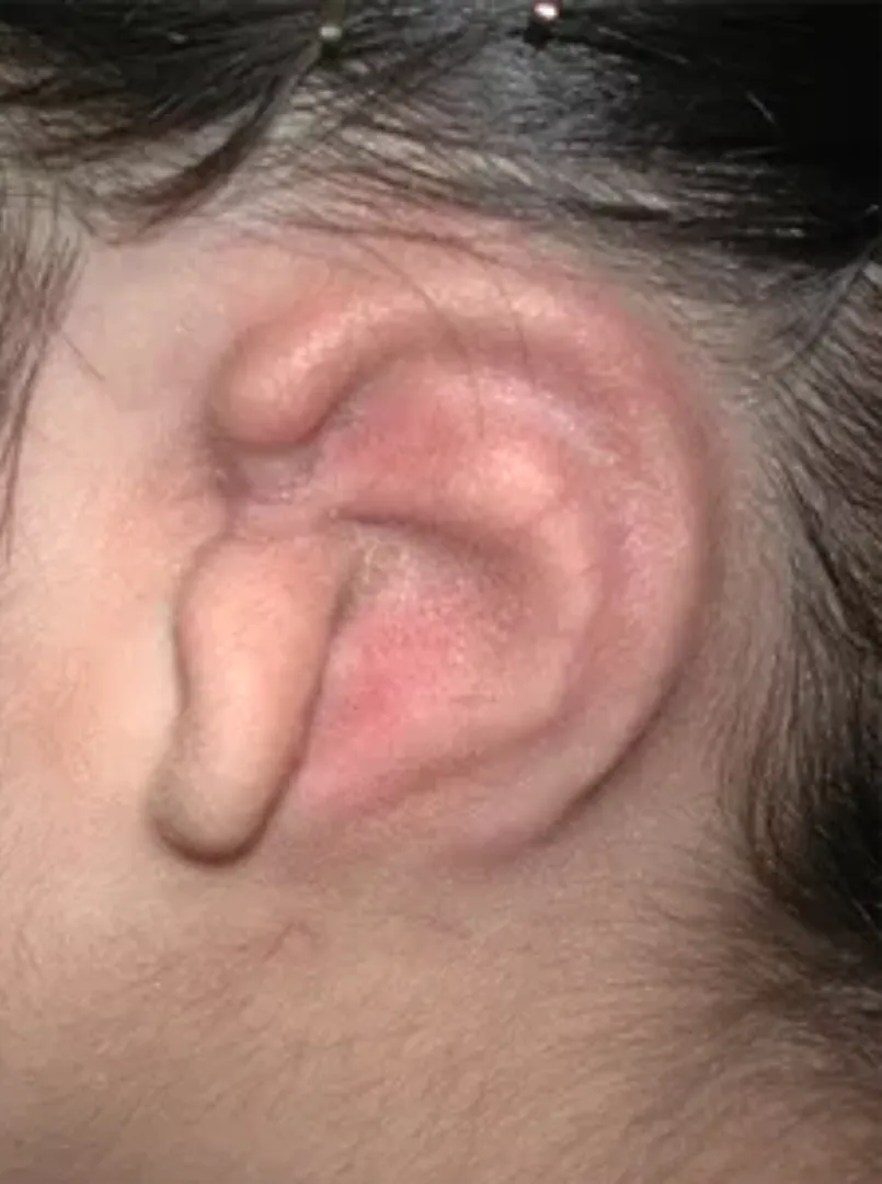 Someone born with a small, deformed ear or ANOTIA - no ear.